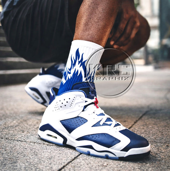 Introducing our socks designed to match the Jordan 6 Olympic, designed for ultimate comfort with a cushioned bottom. The black foot features bold, vibrant colors of Flames-inspired artwork along the leg that won't fade. Made with a blend of 60% nylon, 22% cotton, and 18% spandex, these crew length socks also have a ribbed leg for added support. To keep them looking fresh, wash on a cold delicate cycle with like colors and hang dry, avoiding the use of chlorine bleach.