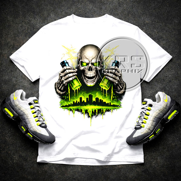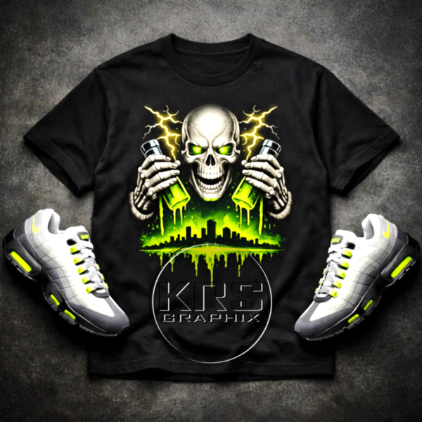 Bring the same electric energy as the Air Max 95 Neon straight to your rotation with this bold sneaker-match tee. Built for sneakerheads who live for crisp color coordination, this graphic hits with a glowing skull, neon energy vials, lightning accents, and a dripping city skyline that pairs perfectly with that grey/black base and volt pop. Whether you’re stepping out for a fit check, pulling up to a kick meet, or posting your latest pickup, this shirt is made to make the shoes look even louder.